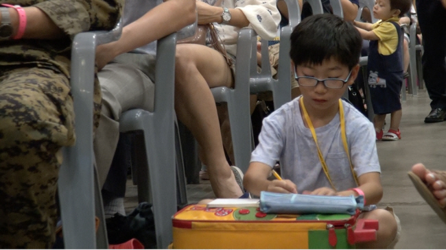 ▲ 대회 참가중인 초등학생이 바닥에 앉아 설교 말씀을 기록하고 있다. 주위의 시선에는 아랑곳 하지 않고 오직 설교에 집중하는 모습이 대견하다.