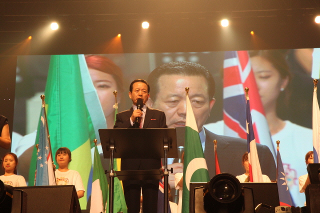 ▲1만5천여명의 렘넌트가 참여한 가운데 대회선언을 하는 대회장 강태흥 목사 .
